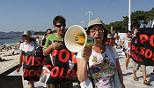 Personal de POVISA protesta en la playa de Samil en una de las movilizaciones previas a la huelga indefinida prevista para el lunes 19 de agosto