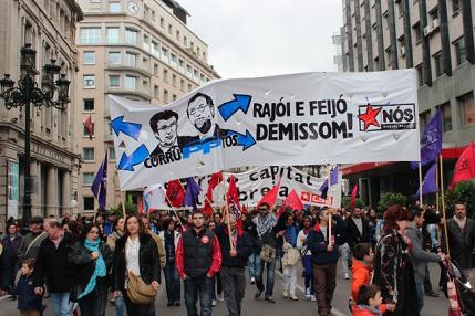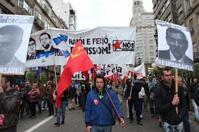 En Vigo ha tenido lugar la movilización más numerosa de las convocadas por la CIG en las diferentes ciudades de Galiza. La izquierda independentista salió pasadas las 11:30 horas de A Dobrada, con cortejo propio formado por tres pancartas y docenas de banderas. El bloque lo abría una fila de carteles con palos que señalaban los diferentes responsables de la crisis económica que está sufriendo el proletariado galego.