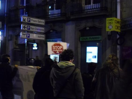 La manifestación principal era convocada para las 20:00h en Compostela. Reunió entre 150 y 200 personas, que recorrieron las principañes calles del centro haciendo paradas y señalando la culpabilidad de los bancos al frente de las sucursales de cada entidad. La protesta recibió voces de apoyo durante su trayecto.