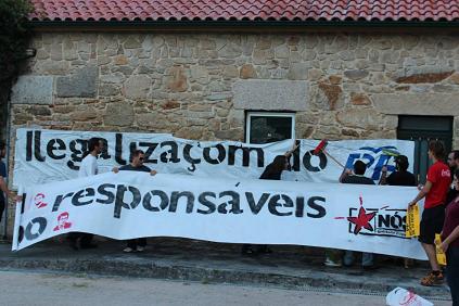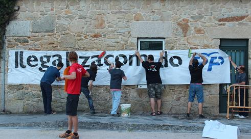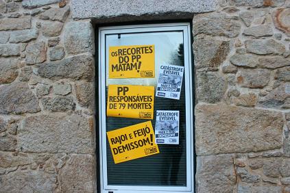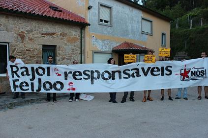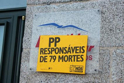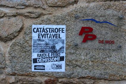 Militantes de NÓS-Unidade Popular se concentraron delante de la sede del Partido Popular de Mós para señalar a los verdaderos culpables de las 79 muertes del accidente ferroviario de Angrois, desplegando una pancarta en que se reclamaban responsabilidades políticas y pegando una gran pancarta en la fachada de la sede para exigir su ilegalización. Mientras tanto, fueron coreadas consiganas como "ilegalizar al Partido Popular" o "Feijó, Rajoi dimisión".