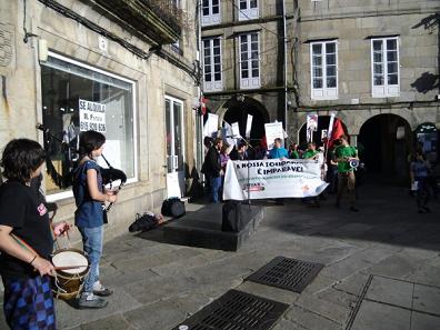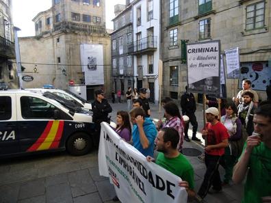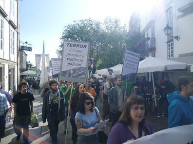 Un helicóptero de la policía española vigiló la protesta durante parte de su transcursso, aunque la presencia represiva se restringió a los alrededores de la Plaza del Obradoiro -donde el príncipe japonés Narohito hacía una visita oficial- y a proteger las oficinas del periódico burgués El Correo Gallego, destacado por su afinidad a la ultraderecha del PP y contra los movimientos populares de izquierda.