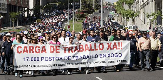 Os 4.000 trabalhadores marcharom pola cidade, horas antes de que o presidente da Junta anunciasse o acordo com Pemex. Os estaleiros de Ferrol e Fene só podem construir barcos militares. E em Fene existe um veto perante a produçom civil até o ano 2015. O titular da Sepi também anunciou ontem que "a partir de agora, o presidente da Junta dará as notícias do naval". A decisom surpreende ao comité de empresa: "Feijóo tenta politizar um grave problema económico e social". Os trabalhadores lamantam-se que "os anúncios de contratos sejam insuficientes, nom há nada de concreto, apenas temos claro que a empresa nom se encontra em quebra técnica".