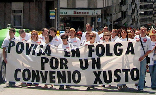 Os e as trabalhadoras vem rebaixado até 40% o seu salário, mermadas as garantias laborais, sofrem irregularidades nos horários e mais flexibilizaçom laboral. Porém Povisa nom sofre nengumha penalizaçom por parte da Junta da Galiza, quando mais de 138.000 pessoas tenhem este hospital de gestom privada de referência.