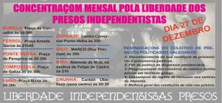 La política penitenciaria del Gobierno Español no mueve ficha. Nosotras si. El día 27 de diciembre en nueve localidades de Galiza estaremos en las calles como ya es habitual apoyando con concentraciones el ayuno de los presos así como las cinco reivindicaciones del Colectivo de Presas/os Independentistas Galegas/os (CPIG):