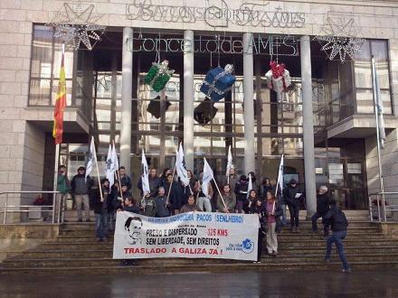 El 17 de diciembre tuvo lugar la tercera de las concentraciones convocadas por Que voltem para casa! para reclamar el traslado a Galiza de los presos galegos. En esta ocasión fue en Ames, el Ayuntamiento natal de Hadrián Mosquera "Senlheiro", y acudieron alrededor de 40 solidarios y solidarias que denunciaronla situación en la que se encuentra Senlheiro y demandaron su traslado a una prisión galega y los respetos a sus derechos fundamentales. Recordamos que Senlheiro lleva casi un año en prisión provisional y está calificado como preso FIES 3. Después de pasar por Soto del REal (a 596 kms.), en la actualidad se encuentra en la prisión asturiana de Villabona, a 325 kilómetros de su aldea de Quistiláns.