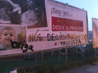 Esta semana as jovens organizadas em Briga do sul da Galiza boicotárom vários paineis publicitários da Conferência Episcopal Espanhola com nova propaganda anti-abortista. Assim, o centro da cidade, o vial à Universidade e a paróquia de Zamáns fôrom limpadas desta propaganda machista, com pintura lilás e as legendas “Nós parimos, nós decidimos”, “Igreja fascista”, “Aborto livre” e “O machismo mata”.