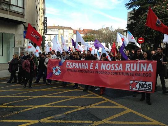 Coincidiremos com todas aquelas que luitem por estes objetivos, com todas as forças, coletivos, organizaçons, ativistas sociais, que consideram que perante a multricrise que padece o Estado espanhol, por parte do campo obreiro e popular há que procurar umha saída política que passa pola ruptura democrática e um processo constituinte galego. Nom som tempos de consensos, de conciliaçons, sim som tempos de superar os labirintos curtoprazistas do eleitoralismo e o parlamentarismo. A rua deve ser o centro de gravidade da luita obreira, nacional e popular.
