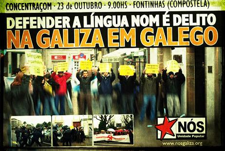 Entre os dias 23 e 26 de outubro, decorre nos julgados de Compostela um julgamento contra esses 11 companheir@s, entre os quais há militantes de NÓS-Unidade Popular. Para tod@s eles/as, o apoio incondicional da nosssa organizaçom e o compromisso e os acompanhar e defender um princípio irrenunciável: Defender a língua nom é delito!