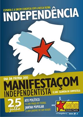 Bajo el lema "España y la UE son nuestra ruina, INDEPENDENCIA" partirá a las 12:30 horas de la Alameda de Compostela la manifestación de la izquierda independentista y socialista galega, siguiendo el trayecto habitual, para concluir en un comicio a las 13:30 horas en la Praça do Toural. Posteriormente, a las 15:00 horas tendrá lugar una comida popular de confraternización en los jardines de San Roque.