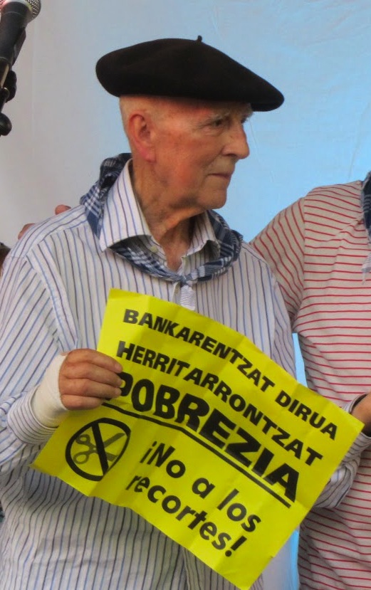 Desde entom é como um companheiro no meu encerro: vejo-o a diário na imprensa, como um avô com o que sempre se pode contar para renovar a fé na defesa da alegria. Periko em muletas abraçando umha mulher que querem botar da sua casa; Periko tras incontáveis faixas polos direitos laborais; Periko no Natal, disfarçado de Olentzero (o Apalpador basco) entregando-lhe carvom a um empresario que despediu trabalhadores… E mesmo, em pleno debate sobre os métodos das Femen, despido e em muletas na rua exigindo a readmissom dum condutor de ambulancias despedido injustamente. Também em muletas se chantou, como um Carvalho quase centenário, perante o neoinquisidor da Audiência Nacional que o pretende julgar por participar no ato de despedida dum preso morto em estranhas circunstancias.