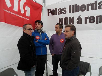 Representantes da CIG estám em greve de fame com o alvo de reclamarem a suspensom da condena de três anos mais um dia a Carlos Bua, responsável da Federaçom de Serviços de CCOO; Carlos Cadórniga, portavoz de CIG-Serviços, e Carlos Froján, delegado de pessoal no sindicato nacionalista por coaçons durante a greve alimentícia 2009.