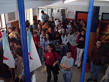 A lo largo de la concentración de protesta se gritaron consignas en favor de la galeguización integral del sistema educativo y contra el profesorado españolista, vinculado indistintamente al PP, el PSOE y en casos a IU. Militantes de AMI repartieron entre los estudiantes hojas informativas en las que se apuntan los nombres de los profesores que se niegan a impartir sus clases en galego. Finalmente, las y los concentrados entraron en el centro educativo exigiendo el cumplimiento del citado decreto, como un mínimo paso en la recuperación de espacios para la lengua galega.
